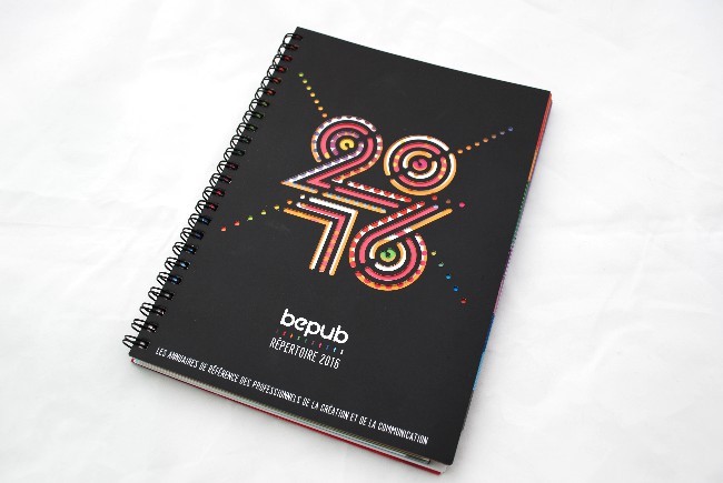 In this Bepub catalogue, A5 with Wire-O binding, recently printed at Pulsio Print, the black cover is cut allowing the colour patterns of the page below to show through. The use of colour is here put at the service of visual presentation on the one hand, and the organization of documents on the other hand, with cut-out coloured tabs that structure the information and facilitate reading.