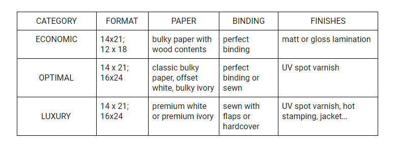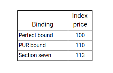 To make up your mind and choose among the various paper rates, colours and qualities, we provide a table below. It will give you an overview that will help make an easier choice. The price indices indicate the change in the total cost of a 196-page B & W book, A5 format, 1,000 copies, depending on the paper used.
